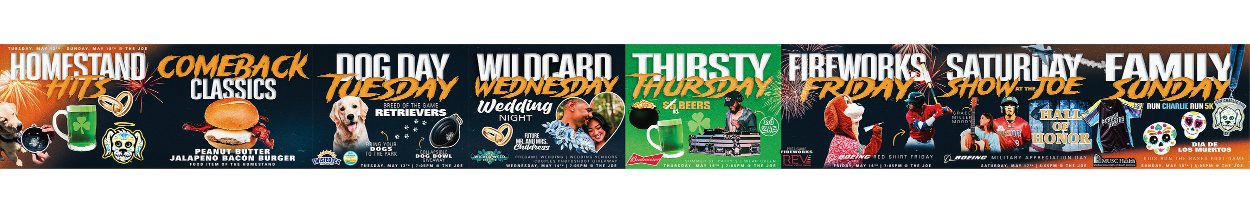 This weekly home-game campaign featured an 8-slide carousel for social media: a bold title slide, a “comeback” food item from previous seasons, and individual slides previewing each game of the homestand. Using grunge-inspired typography, textures, and design elements, the series provided clear promotional information for the game-week ahead.